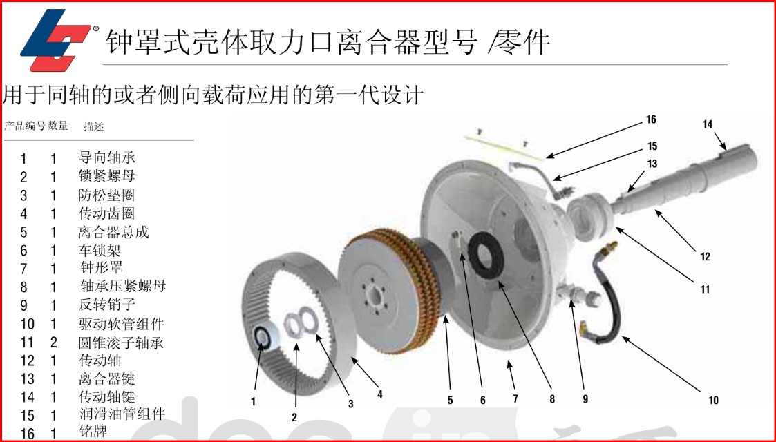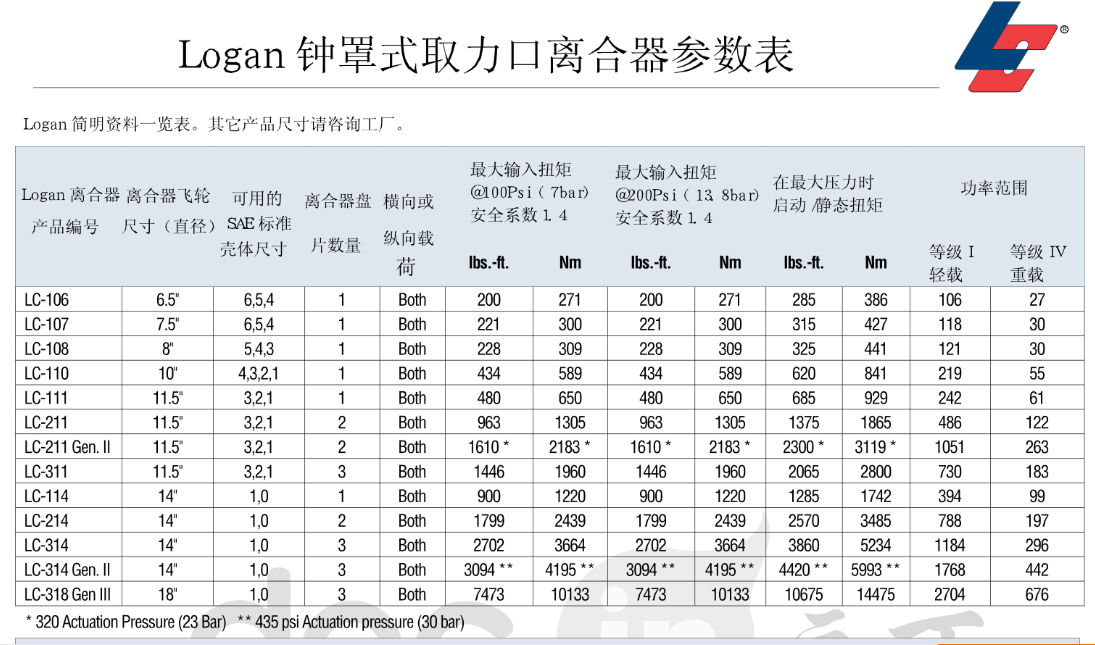 Logan氣/液驅(qū)動 鐘罩式殼體取力口離合器式自調(diào)節(jié)的,設(shè)計成直接安裝到柴油發(fā)動機或者汽油發(fā)動機的飛輪上。摩擦圓盤組為干式應(yīng)用設(shè)計。通過一個固定的缸套-活塞布置或者通過內(nèi)置軸和離合器油道來完成。離合器的傳動軸通過內(nèi)孔或鍵槽來安裝。扭矩從盤片組傳遞到安裝在發(fā)動機飛輪上的齒輪傳動齒圈上。Logan離合器主杠加壓, 推動活塞夾緊或鎖住摩擦片或分離鋼片。當壓力移走, 回位彈簧使摩擦片和鋼片分離, 當鋼片和摩擦片分離后, 可以保持運行間隙。